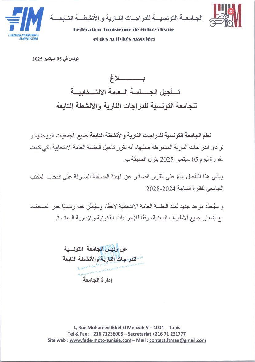 تتشرف الجامعة التونسية للدراجات النارية و الأنشطة التابعة بدعوة السادة رؤساء الأندية و الجمعيات الرياضية للدراجات النارية المنخرطة صلب الجامعة لحضور أشغال الجلسة العامة الخارقة للعادة التي ستنعقد يوم السبت 21 سبتمبر 2024 بداية من الساعة التاسعة صباحا بقاعة الاخبار العلمية بمدينة العلوم بمركز العمران الشمالي.