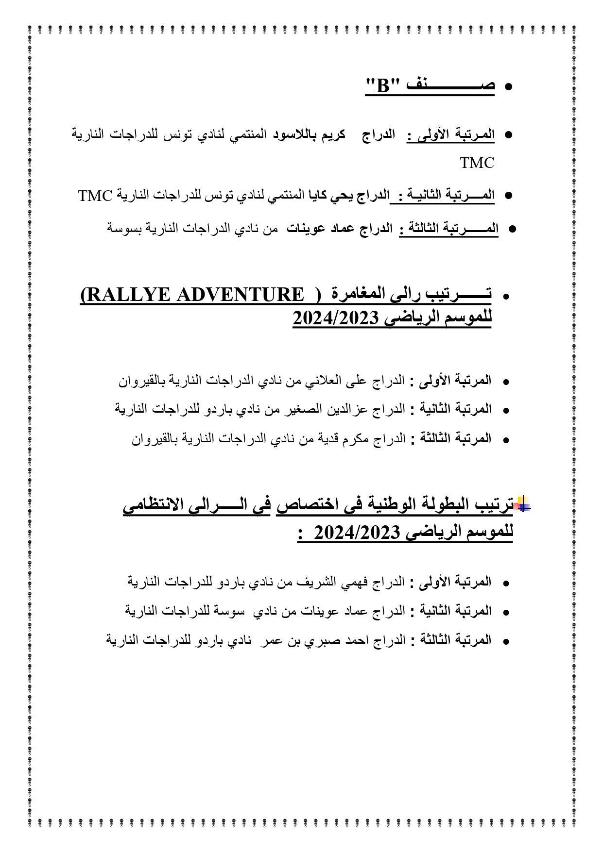 تبعا للبلاع العام يوم 23 ماي 2024 المتعلق بتنظيم روزنامة بطولات التجمع السياحي و رالي المغامرة حيث تتزامن التواريخ مع عيد الإضحى ، تعلم الجامعة التونسية للدراجات النارية و الأنشطة التابعة انه بسبب تعرض بعض الدراجين الي إصابات و تعطب الدراجات النارية و بإقتراح من نادي الرياضات الميكانيكية ببنزرت و الذي كان من المفترض احتضانه للجولة الثالثة من بطولتي الموطوكروس و سباقات التحمل يومي 1 و 2 جوان 2024 و الجولة الثالثة من بطولة رالي المغامرة (Adventure ) يوم 8 جوان 2024 و الجولة الرابعة من بطولة التجمع السياحي فقد تقرر ما يلي :
