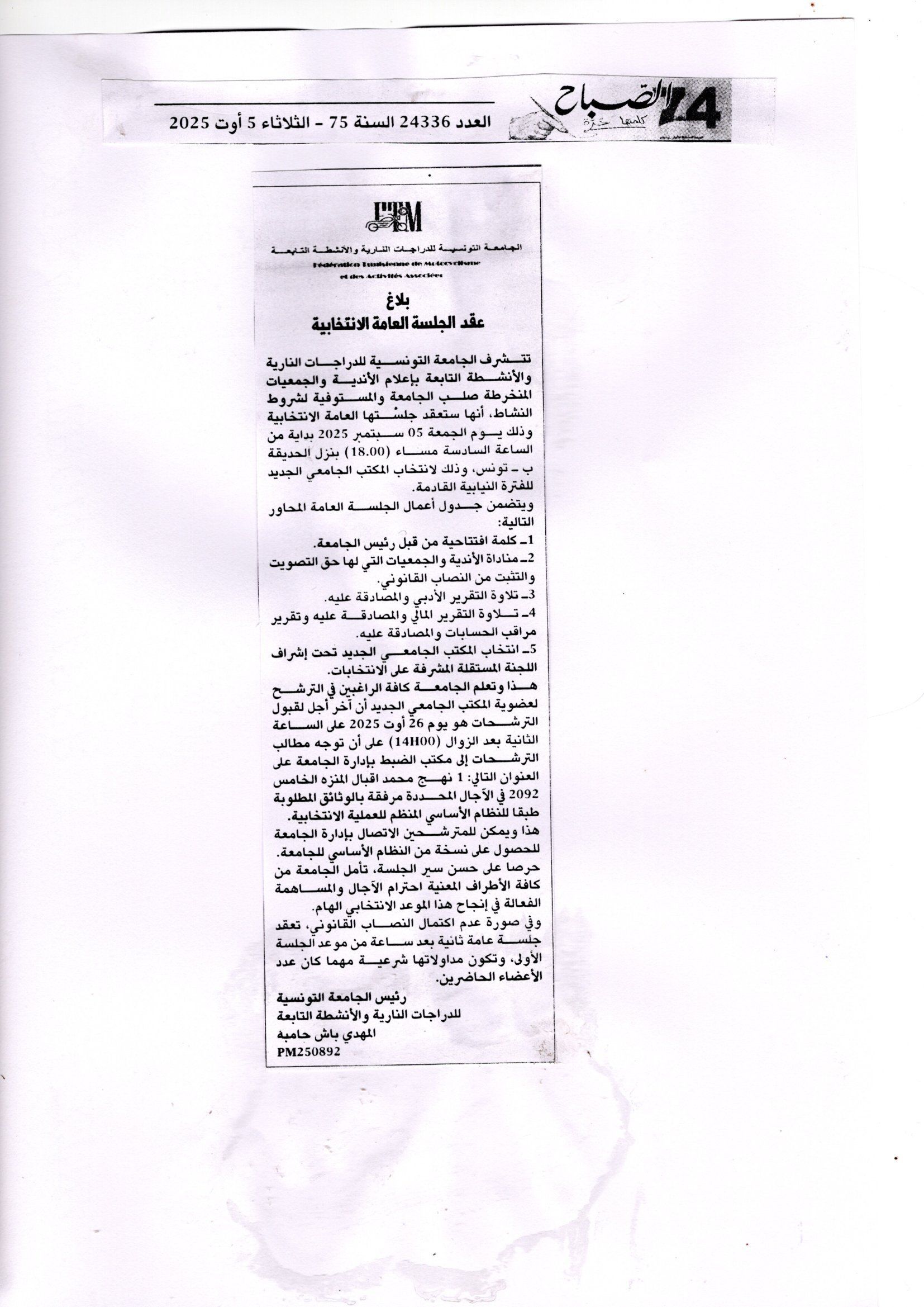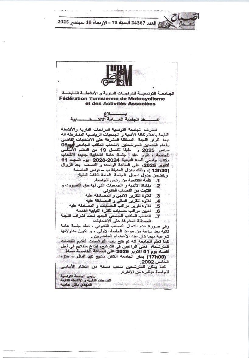 - مناداة الأندية و الجمعيات المنخرطة صلب الجامعة التونسية للدراجات النارية و الأنشطة التابعة و التي لها حق التصويت